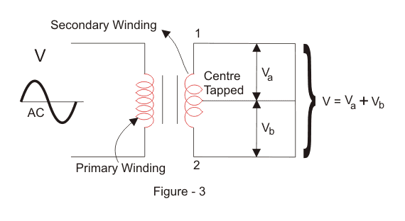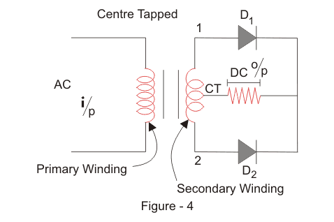 我们将交流电压应用于输入变压器。在AC电压的正半周期期间,端子1将是正的,中心抽头将处于零电位,端子2将是负电位。