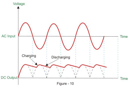 当应用的交流电压开始减小并且小于电容器时,电容器开始放电慢慢地,但与之相比,这比电容器充电,并且它没有得到足够的时间来排出,并且充电再次开始。