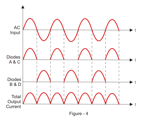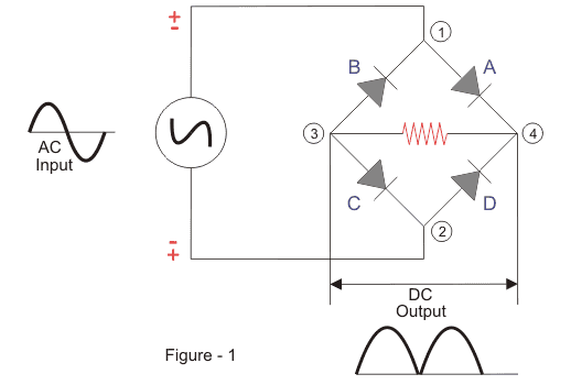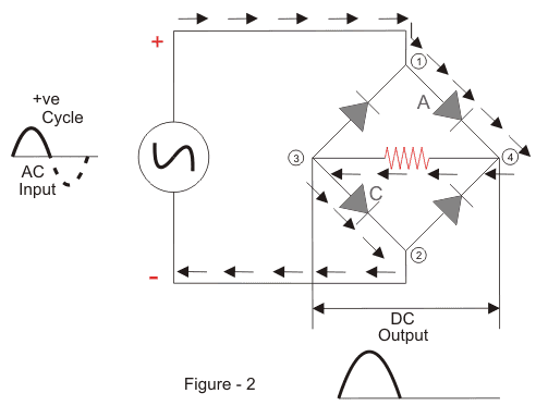 这将导致二极管A和C变为正向偏置,电流将流过它。同时,二极管B和D将变为反向偏向并通过它们阻塞电流。电流将流量从1到4到3到2流。