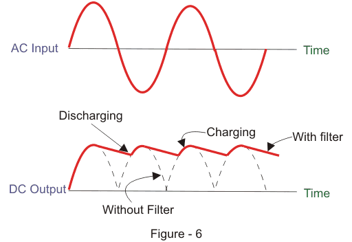 当我们应用恰好比电容器电压发生超过的输入交流电压时,它将电容器立即充电到输入电压的最大值。此时,电源电压等于电容器电压。