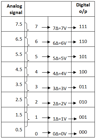 编码:这里;对于每个量子,将分配一个唯一的数字代码,并且在通过该数字代码分配输入信号之后。量化和编码过程在下表中说明。