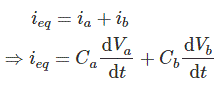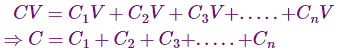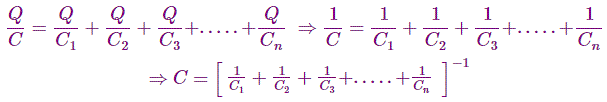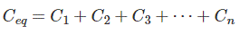 因此,当n个电容器并联时,整个连接的等效电容由下式给出,类似于串联时电阻的等效电阻。