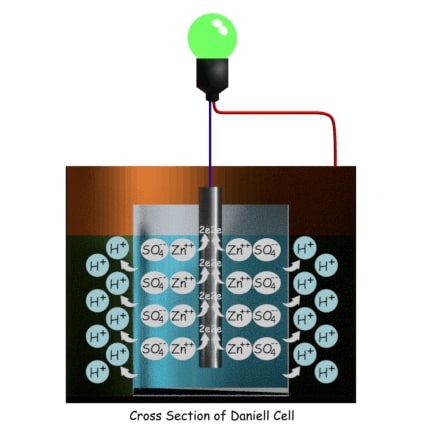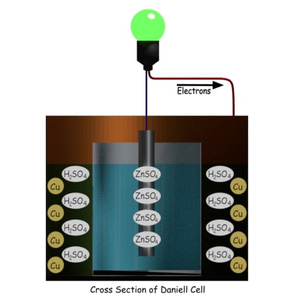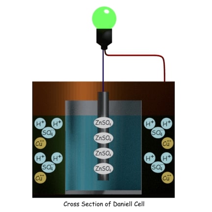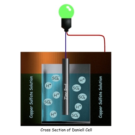 它由填充有浓缩硫酸铜溶液的铜容器组成。在容器内部,有一个填充有稀释的硫酸的多孔圆柱形罐,浸入浓缩的硫酸铜溶液中。将一个汞合金锌棒浸入多孔罐中的稀释硫酸中。随着稀释电解质的稀释形式的硫酸的性质存在于阳性氢离子和阴性硫酸盐图标中。硫酸锌离子与锌释放电子对杆接触并通过氧化反应产生硫酸锌。结果,锌棒变得带负电并表现为阴极。