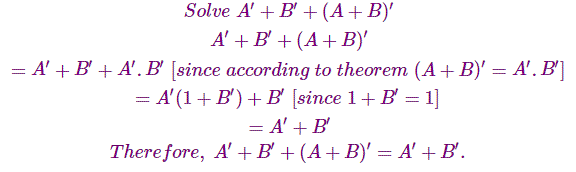 现在在每一行中非常仔细地看看桌子。Firstly the value of A = 0 and the value of B = 0. Now for this values A’ = 1, B’ = 1. Again A + B = 0 and A.B = 0. Thus (A + B)’ = 1 and (A.B)’ = 1, A’ + B’ = 1 and A’.B’ = 1. From this table you can therefore see that the value of column no 7 and 8 are equal and column no 9 and 10 are also equal which proves the De-Morgan’s theorem.