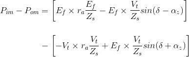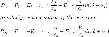 现在我们推导出圆柱转子同步电动机的各种功率流方程。为了推导出a的各种幂方程同步电动机让我们替代电压源e1等于激励电压(Vt),电压源E2等于终端电压(Ef)时,上述电路的电感阻抗等于同步阻抗(Z年代)和Z年代= r一个+ jX年代。在替换完所有这些之后,我们将得到电源E的输入功率1等于发电机(P搞笑)。所以,