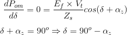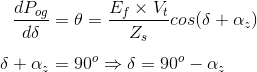 现在我们可以推导出发电机最大功率输出条件的表达式。为了推导出最大功率输出条件,我们首先对上面已经推导出的发电机功率输出方程的表达式进行微分,然后使方程等于零。当等于零时,我们将得到在最大功率输出条件下和的角度关系。数学上我们有L