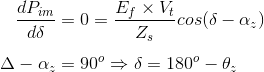 现在我们可以推导出最大功率输出条件的表达式同步电动机。为了推导出最大功率输出条件,我们首先对上面已经推导出的同步电机功率输出方程的表达式进行微分,然后使方程为零。当等于零时,我们将得到在最大功率输出条件下和的角度关系。数学上我们有L
