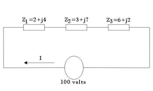 串联连接。在串联连接的这些阻抗中,100V的电压源如下所示连接。确定每个阻抗两端的电压。