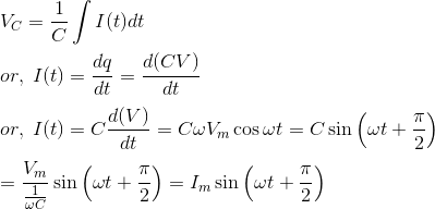 因此,从上面很清楚单相电力计算在电容器电流的情况下,I(t)和V(t)通过π/ 2的角度引入电压。
