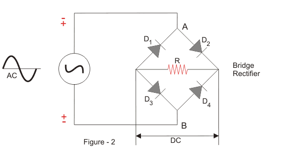 我们使用二极管,即形成桥电路的A,B,C和D.电路图如下。
