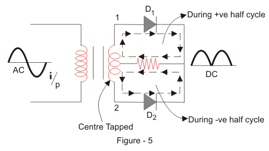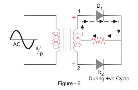 我们将交流电压应用于输入变压器。在AC电压的正半周期期间,端子1将是正的,中心抽头将处于零电位,端子2将是负电位。