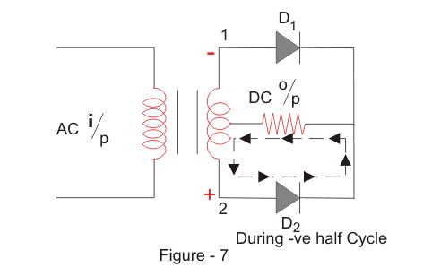 在输入交流电压的负半周期期间,端子2将相对于端子2和中心抽头变为正。这将导致二极管D的转发偏差2并导致电流流过它。在此期间,二极管D1处于反向偏见,并通过它阻止电流。