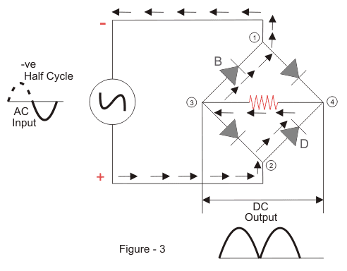 这将导致二极管A和C变为正向偏置,电流将流过它。同时,二极管B和D将变为反向偏向并通过它们阻塞电流。电流将流量从1到4到3到2流。