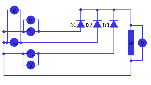 为纯电阻负载供电的三相半波整流器的典型配置如下图所示。在这里,变压器的每一相位被认为是一个单独的交流电源。电压的模拟和测量如下电路所示。这里我们连接了一个人电压表跨越每个来源以及负载。