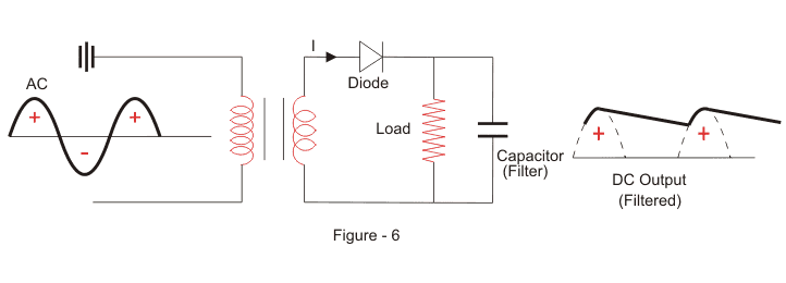 下面的电路图显示了如何使用电容滤波器来平滑一个脉动直流波形到一个恒定直流波形。