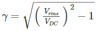 为了量化半波整流器可以将交流电压转换为直流电压,我们使用所谓的纹波因子(由γ或r表示)。涟漪因子是比率均方根值AC电压(在输入侧)和整流器的直流电压(在输出侧)。