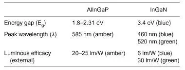 电子能量隙中的能量隙,称为辐射重组,产生光子(即,光),而分流能量转变,称为非辐射重组,产生声子(即加热)。典型的Alingap LED和针对不同峰值波长的IngaN LED的发光效率如下表所示。GydF4y2Ba