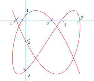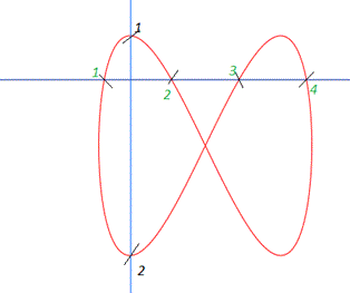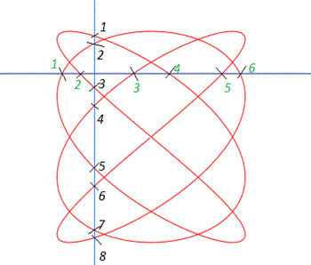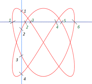 要用利萨图来确定信号的频率比,只需在利萨图上画任意横线和垂线与利萨图相交即可。现在用这些水平线和垂直线的利萨尤模式来计算水平和垂直切线的数量。