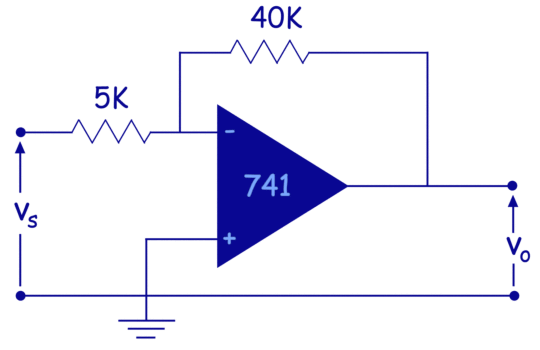 当我们连接反馈电阻和一个抗性系列使用OP-AMP的反相输入端子如上图所示,系统的增益刚刚成为对输入电阻的反馈电阻的负比。运算放大器有自己的增益。增益实际上非常大,理想情况下,它是无限的。无论运算放大器自身的增益(开环增益)都可以对系统强加预定增益。我们通过选择串联输入电阻的适当值来执行此操作(R一世)和反馈电阻(RF)。OP-AMP系统的增益应该是