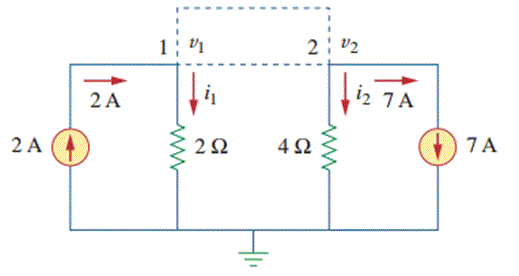 在下面的电路中,我们有3个节点,其中一个是参考节点,其他两个是非参考节点-节点1和节点2。