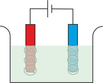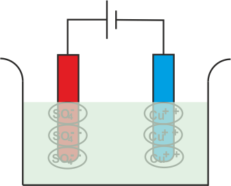 CU+ +离子(阳离子)朝向阴极吸引。连接到电池的负端子的电极。在达到阴极上,每个CU+ +离子将从其上取电子并变成中性铜原子。