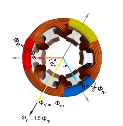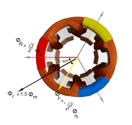 其中,φ.R.,φ.y和φ.B.是相应的瞬时通量红色的那黄色的和蓝色阶段绕组,φm磁通波的幅度。空间中的磁通波可以表示如下所示。