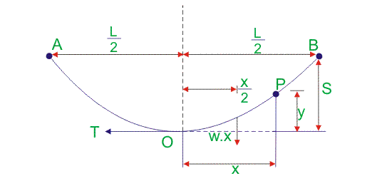 考虑一个传输线导体AOB自由悬浮在同一水平(等跨)的水平支撑点a和B之间。导体的形状为抛物线,其最低点为O形。