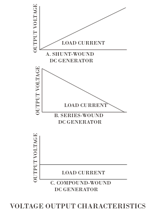 在复合发电机中,当负载电流增大时,电枢电压自动降低磁场由并联绕组产生的减少。但同样增加的负载电流流过串联绕组,导致磁场增加。因此,并联磁场的减小由串联磁场的增大来补偿。通过他的方法,输出电压保持不变,如图所示。