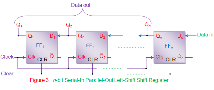 在右移SIPO移位寄存器中,数据位为每个时钟滴答而从左向右移位。然而,如果数据位在同一设计中从右向左移位,则会得到如图3所示的左移SIPO移位寄存器。然而,基本的工作原理保持不变,除了现在Bn到B1存储在Q中n去问1例如问1= B1,问2= B2……问n= Bn在nth时钟周期。