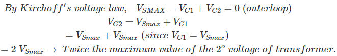 但是当没有加载这个时电容器,然后电容器都将处于充电状态。那是C.1带V电荷Smax.和c2被指控2VSmax.。在负半周内,C2再次收取费用(2VSmax.)。在接下来的半周期中,通过电容器C获得通过电容器滤波器过滤的半波2。这里,纹波频率与信号频率相同。可以从该电路获得3KV的直流输出电压。