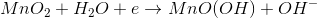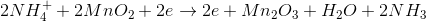 在leclanche电池细胞氯化铵(NH4.Cl)以NH的形式存在于电解质混合物中4.+和Cl.-。在阴极mno.2将减少到Mn2O.3.与铵离子反应(NH4.+)。除了mn2O.3.该反应也产生氨(NH3.)和水(h20)。