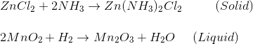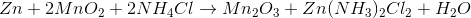 在碳电池中,该氨气进一步与氯化锌反应(ZnCl2)形成固体氯化锌和气态氢与二氧化锰反应,形成固体二锰三氧化物和水。这两个反应防止了电池放电期间的气体压力。
